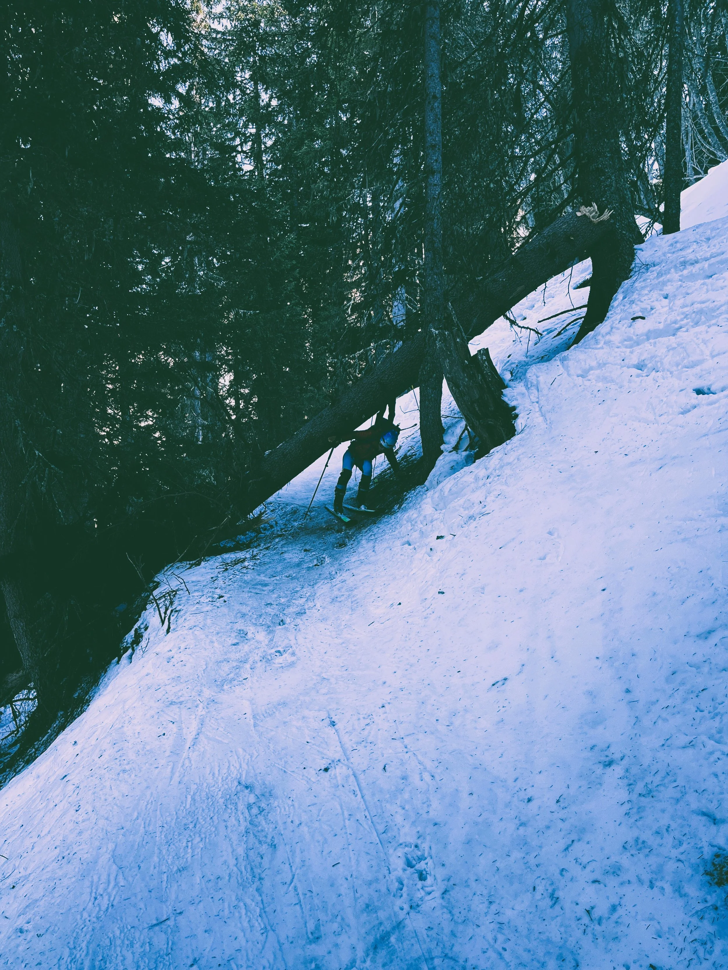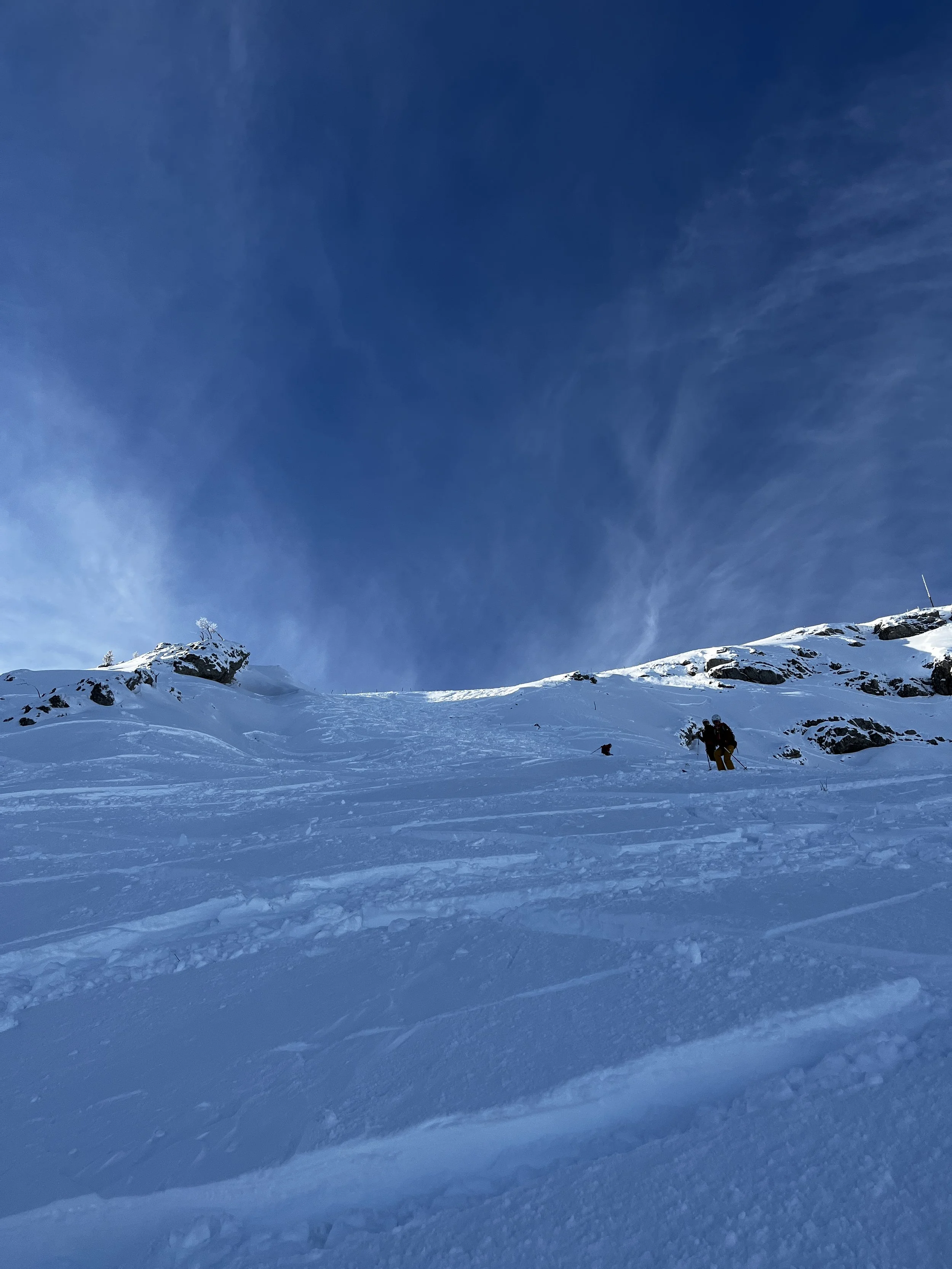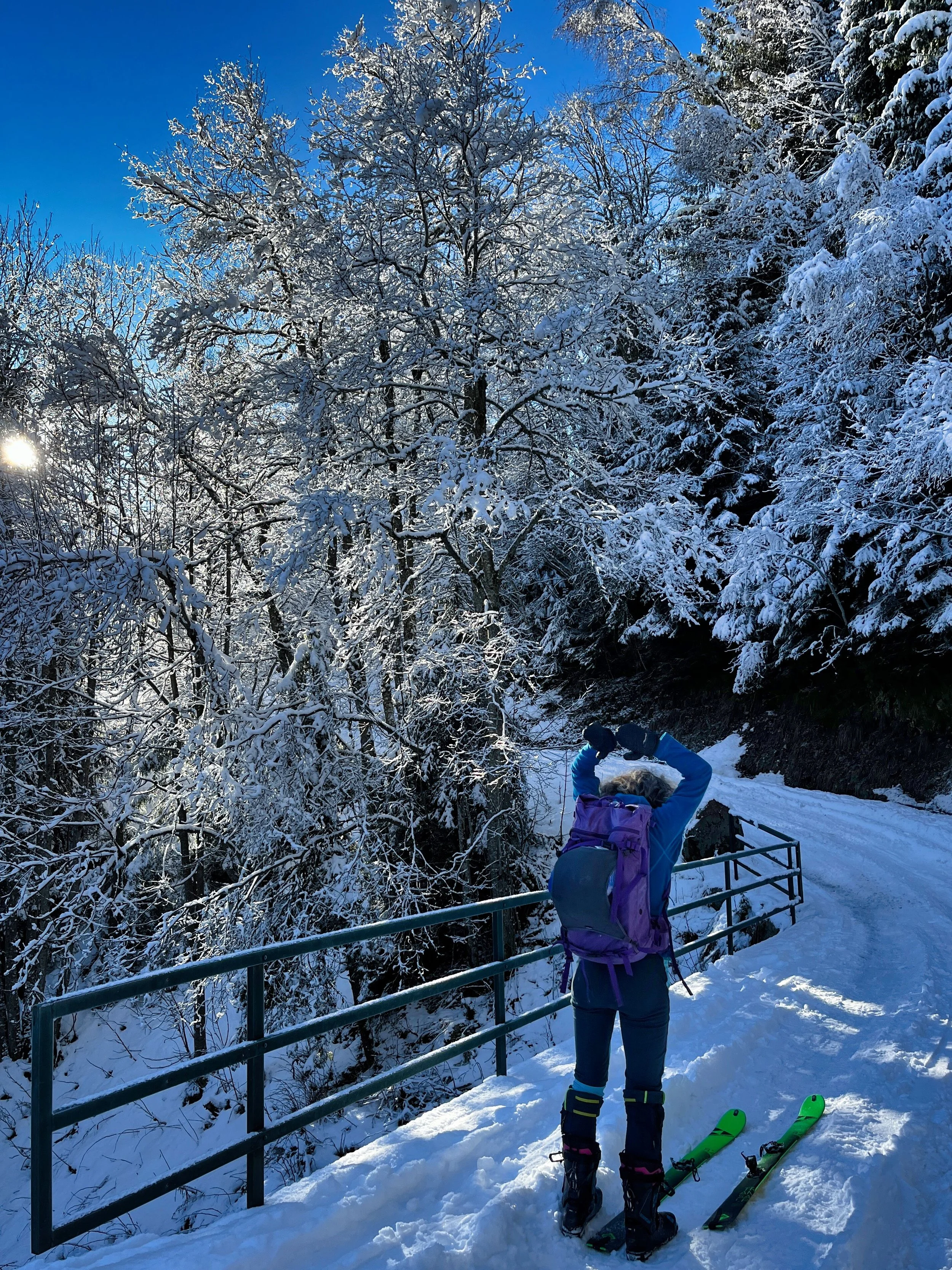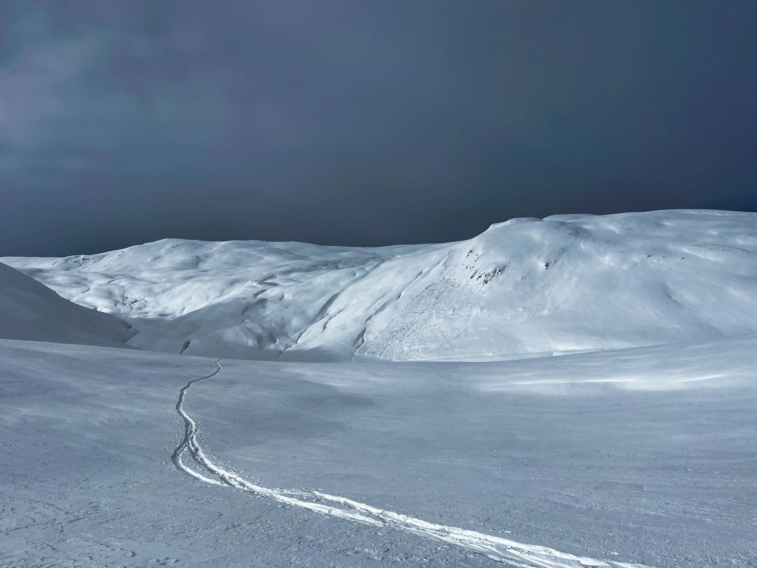 We took the guidebook’s advice and aimed for Laupstad, where two relatively easy summits promised a good warm-up. I liked it immediately. Unlike the Alps, where established skin tracks tend to funnel you into an obvious route, here we had to figure things out for ourselves. The first 200 meters involved bushwhacking through shrubs, balancing over half-frozen streams, and generally pretending we knew what we were doing. It felt like earning our turns, or at least that’s what I told myself.