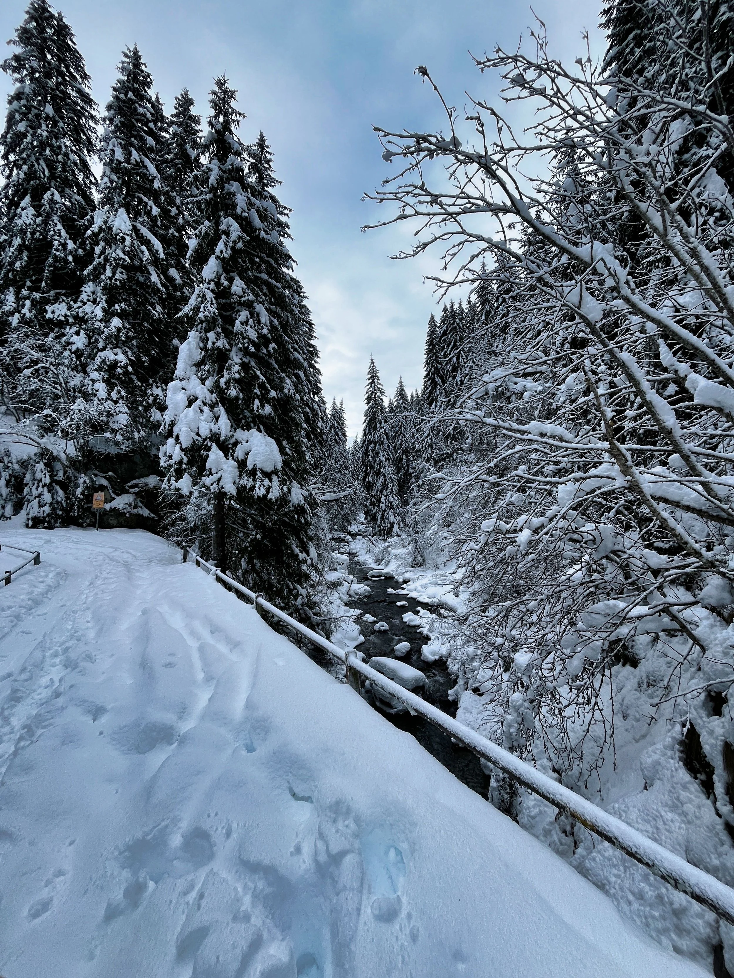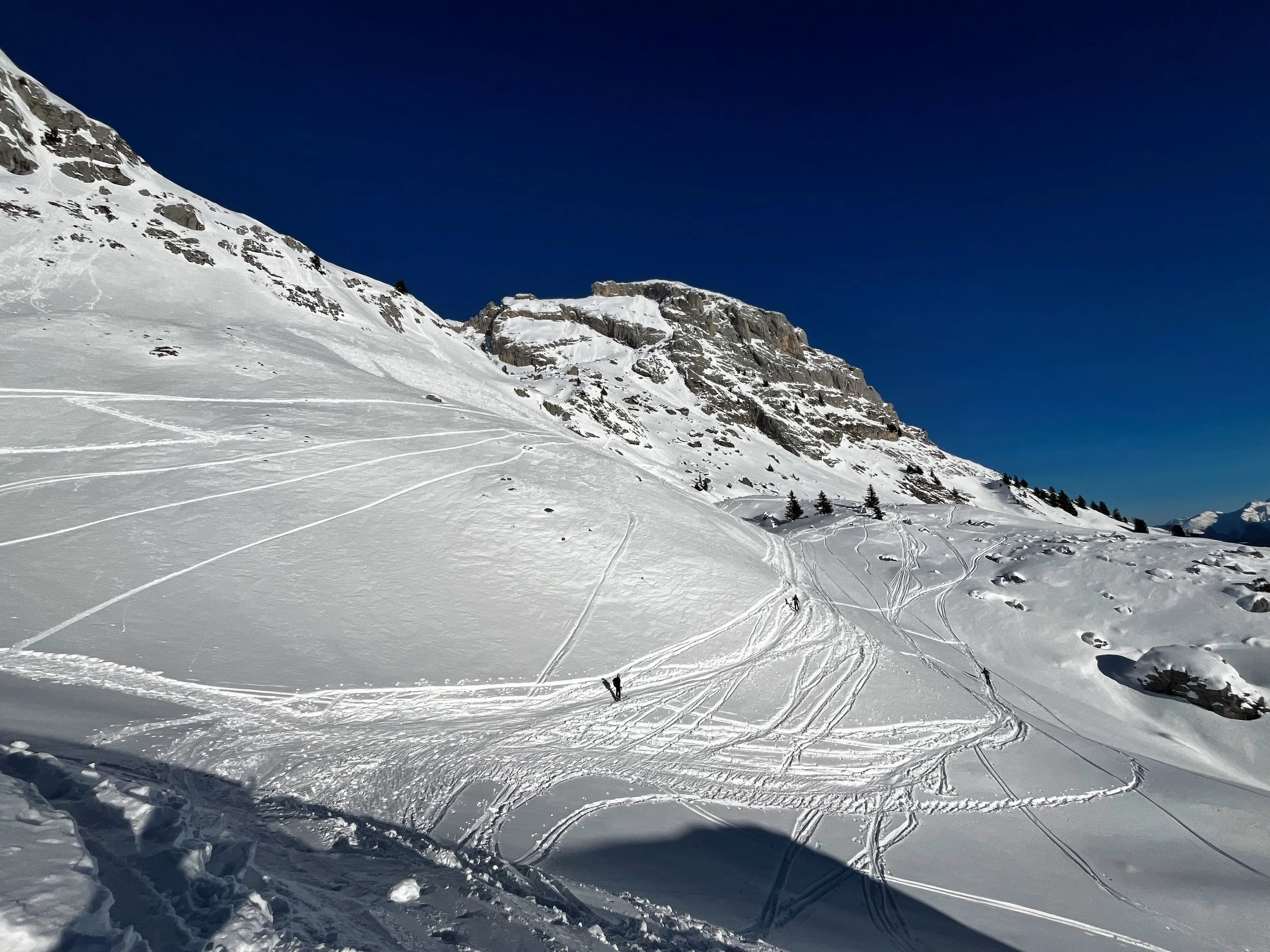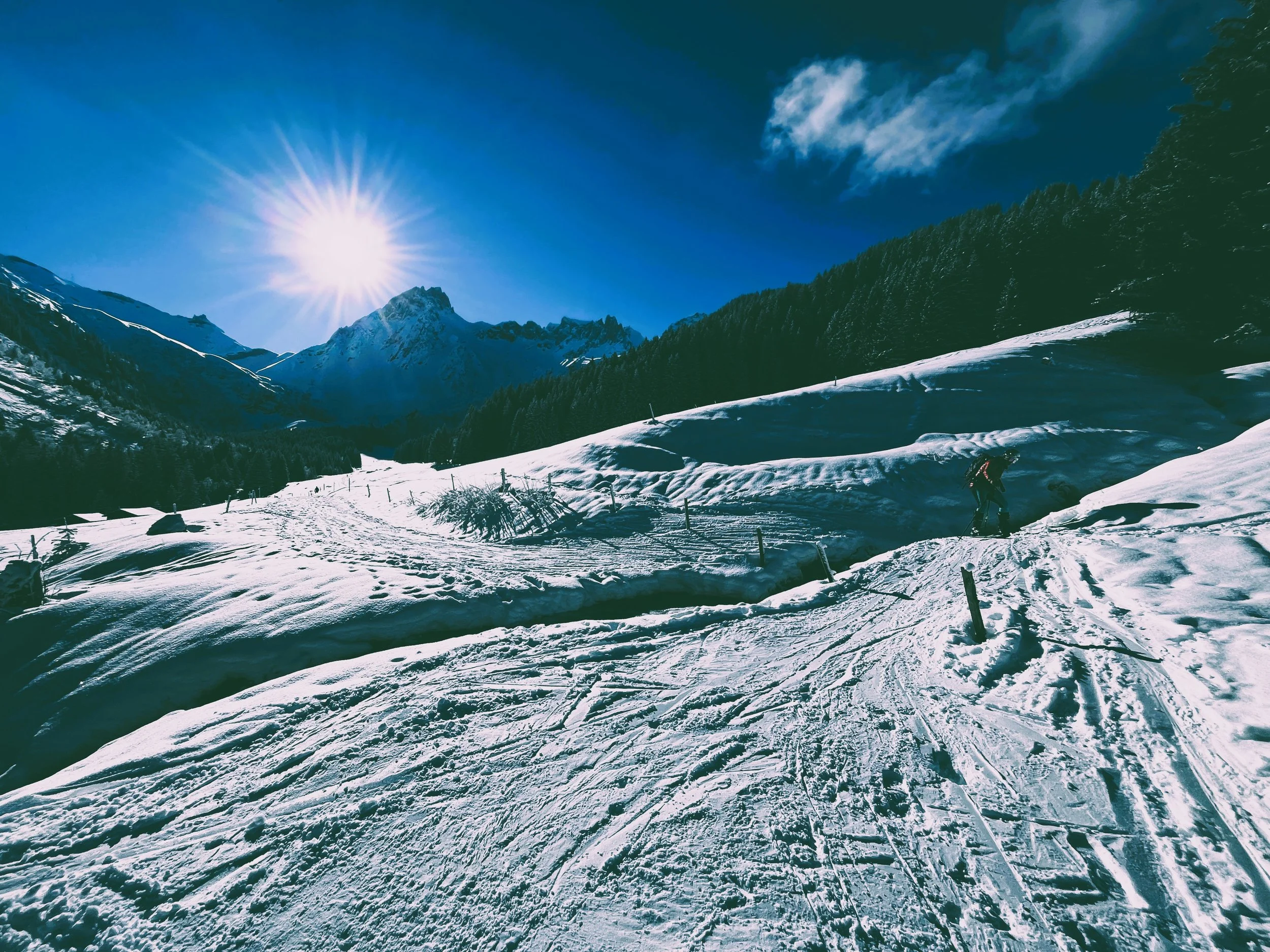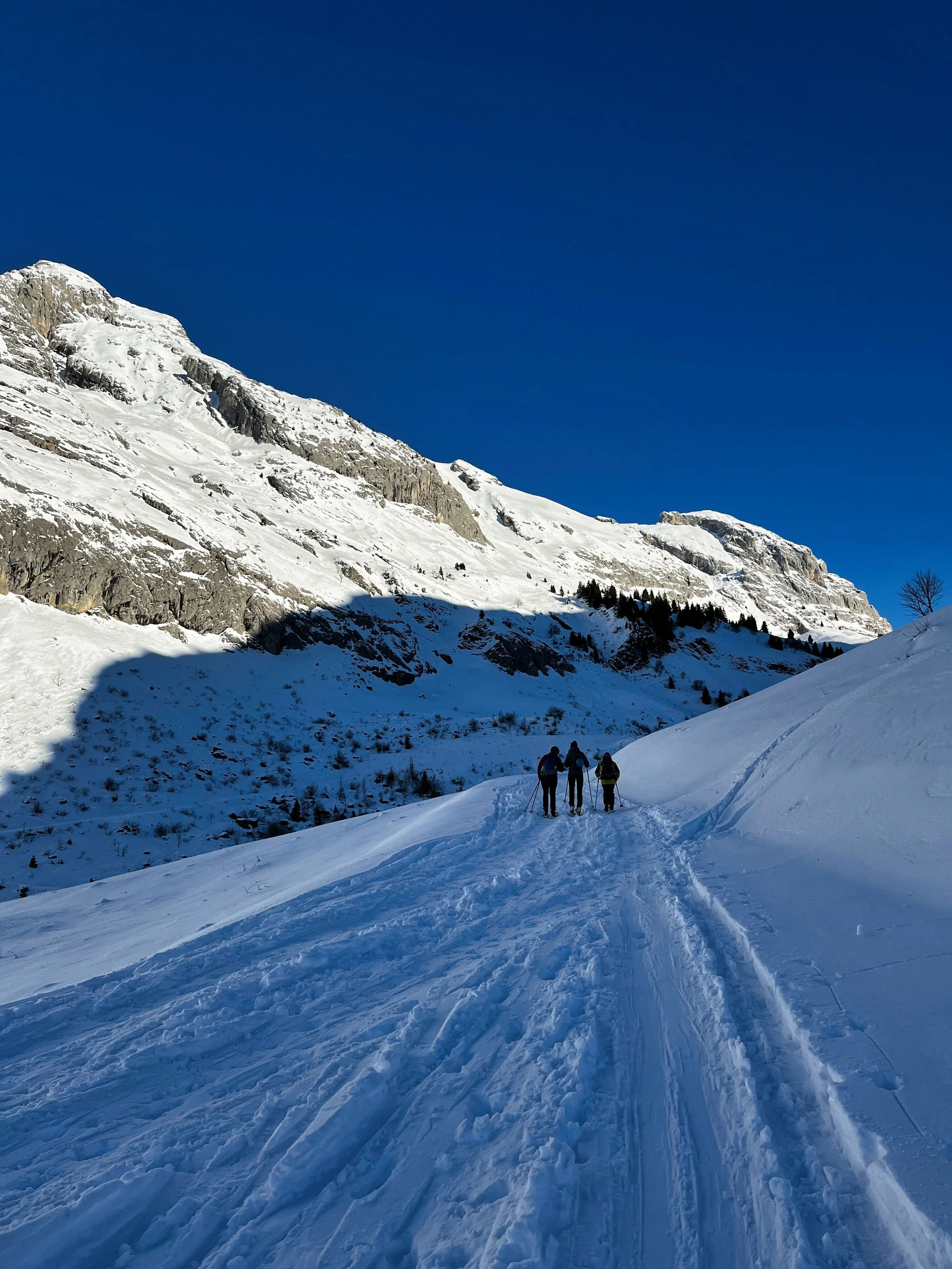 We took the guidebook’s advice and aimed for Laupstad, where two relatively easy summits promised a good warm-up. I liked it immediately. Unlike the Alps, where established skin tracks tend to funnel you into an obvious route, here we had to figure things out for ourselves. The first 200 meters involved bushwhacking through shrubs, balancing over half-frozen streams, and generally pretending we knew what we were doing. It felt like earning our turns, or at least that’s what I told myself.