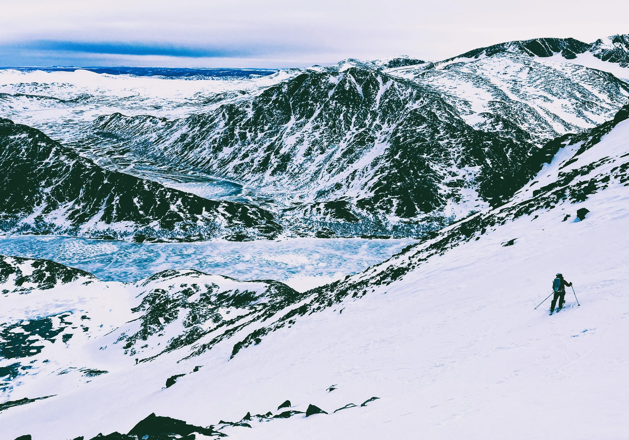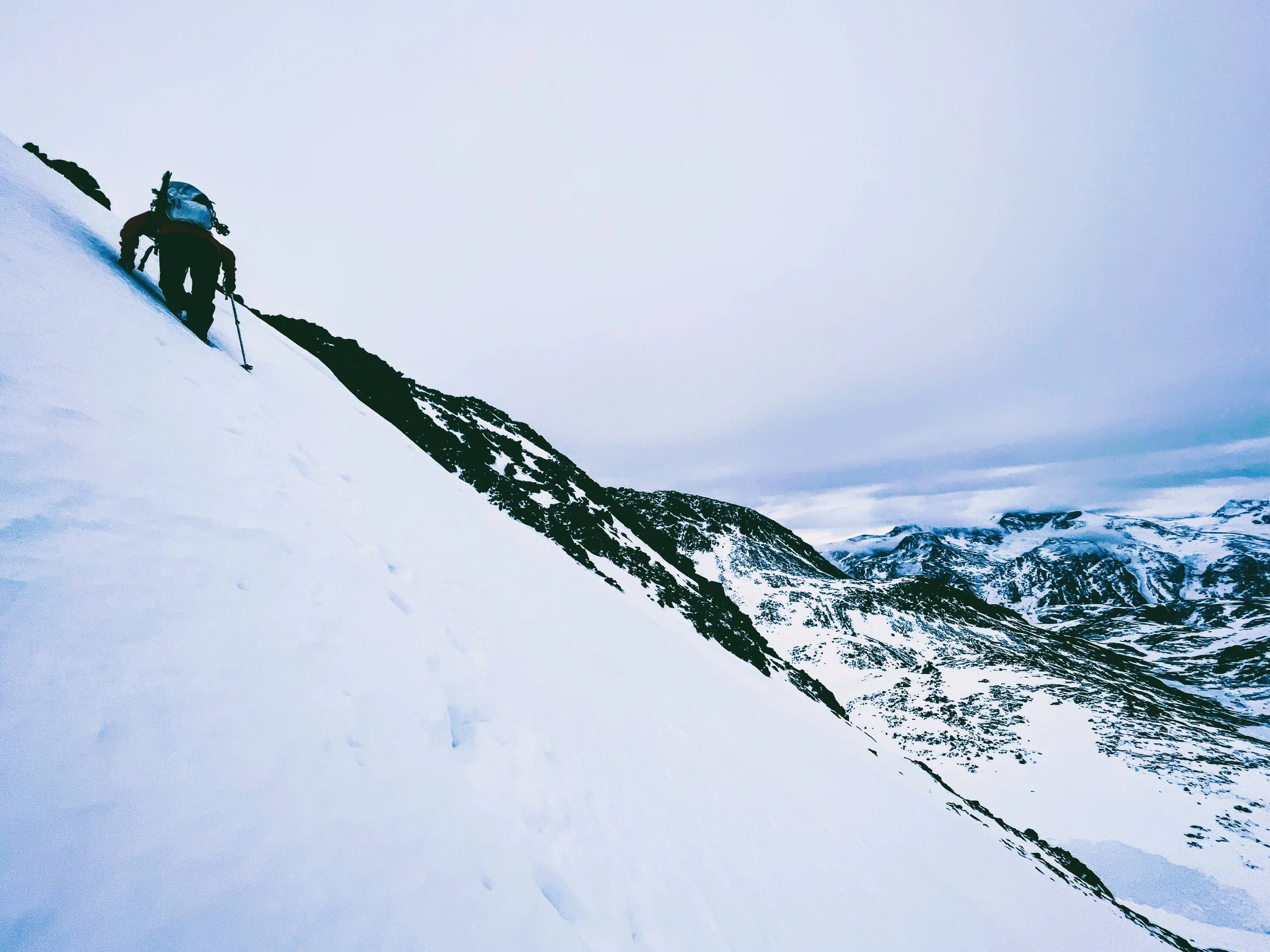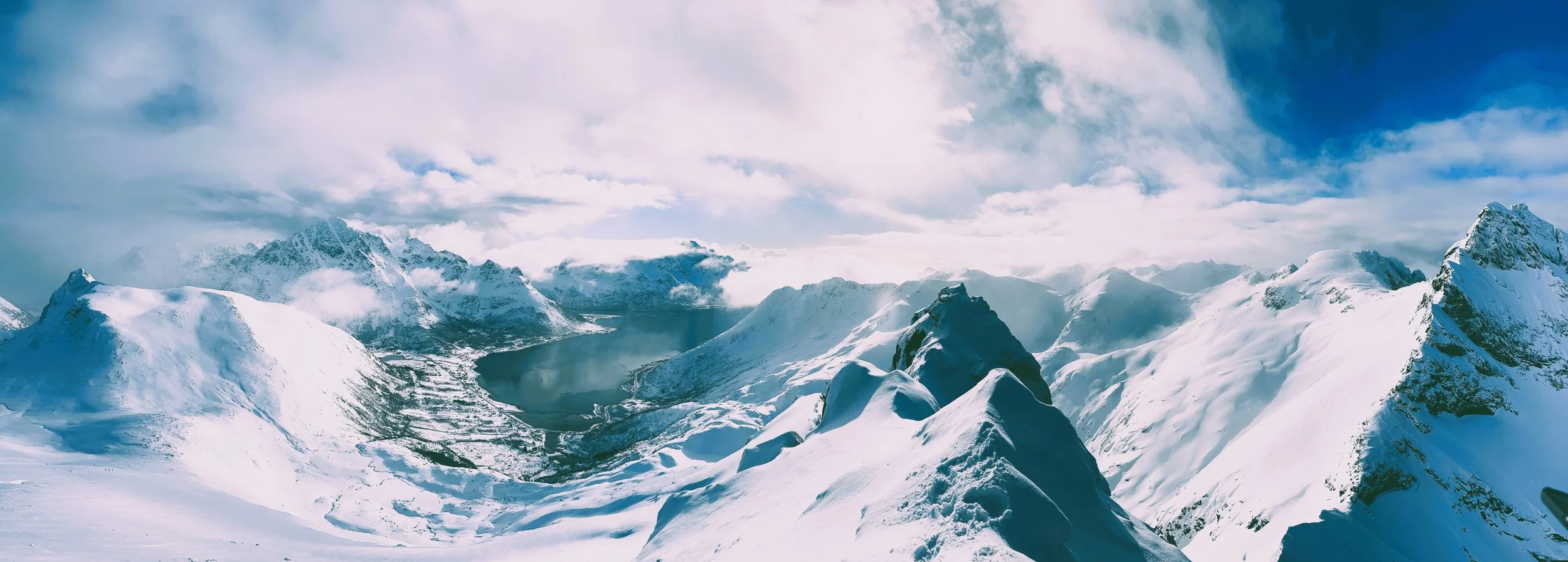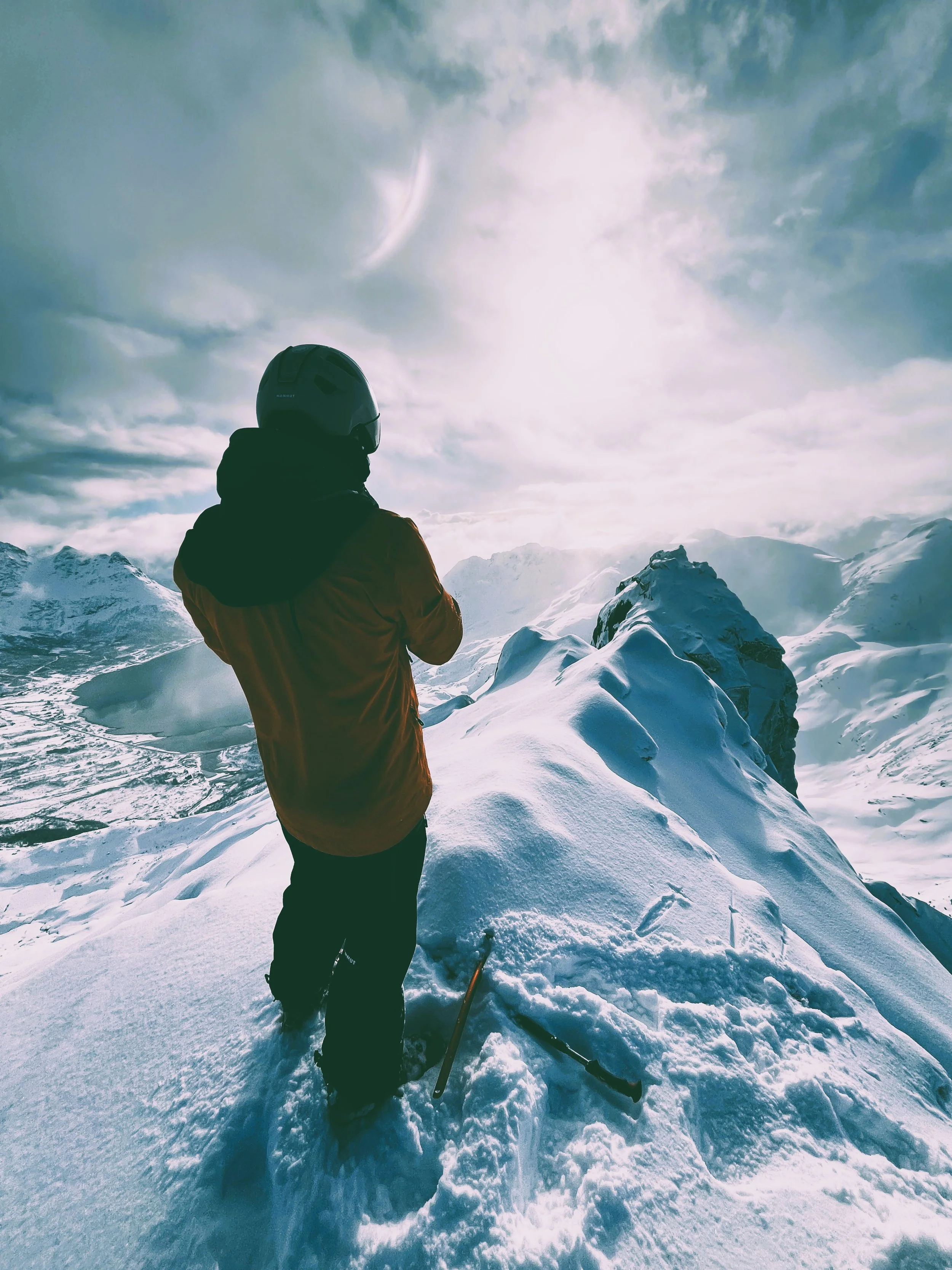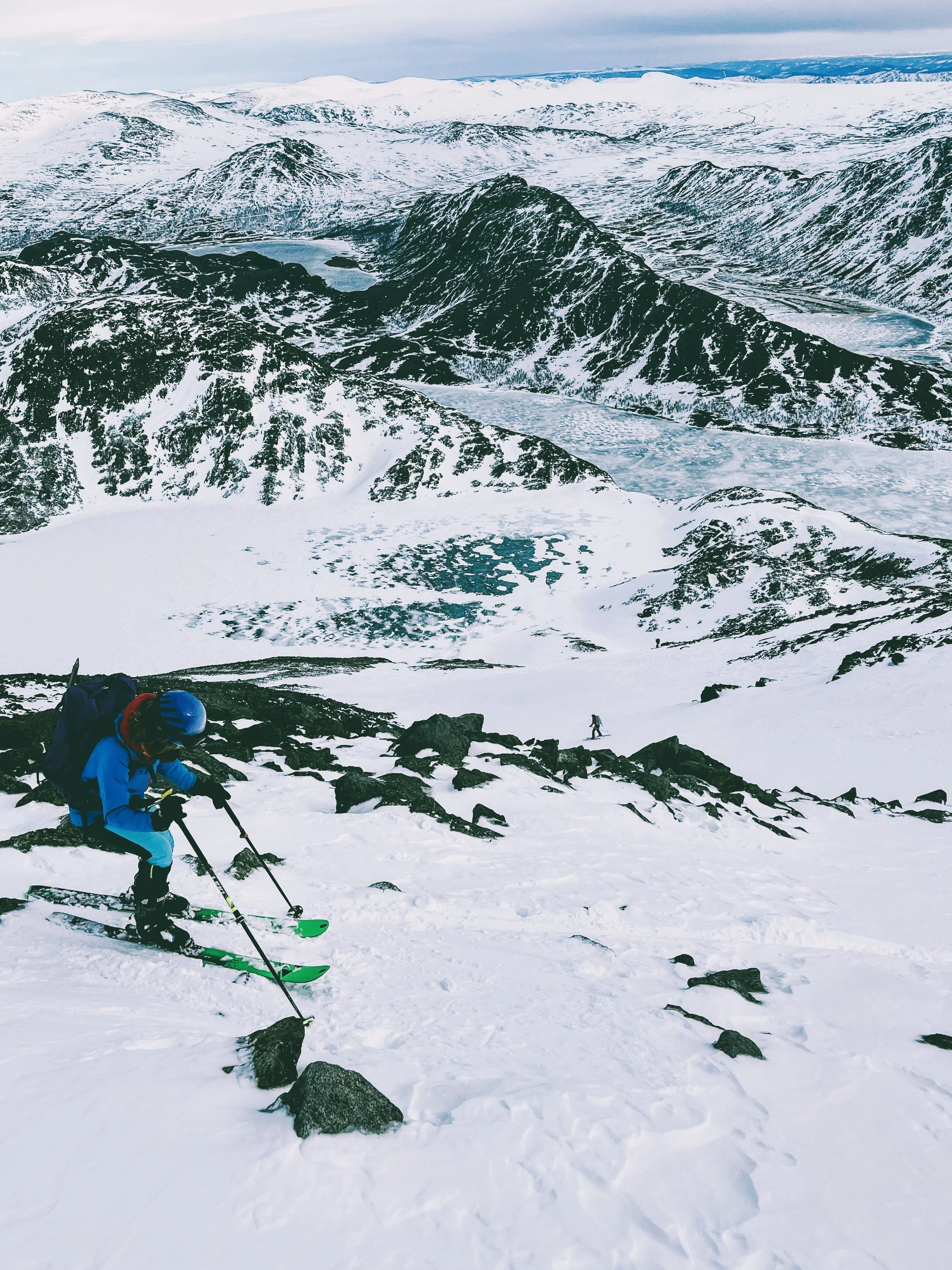 The first peak, Pilan, was straightforward enough. We reached the col, swapped skis for crampons, and scrambled up a ridge to the summit. The views? Snow-covered peaks plunging straight into the fjords, classic Lofoten. The ski down was actually enjoyable—fresh snow on a solid base, a rare combination this season. So far, Lofoten was outperforming the Alps.
